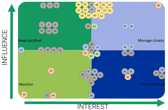A stakeholder map example to identify the most relevant stakeholders for advancing the marine biotechnology field. The dots indicate individual stakeholders and they are numbered for their easier identification in the individual stakeholders’ lists (these are not presented due to confidentiality reasons), and their placement indicated their combined interest and influence in the sector. Based on their positioning on the map, these stakeholders can be invited to form strategic collaborations. Dots are color-coded to represent their sector (grey—administrative and public bodies; grey/blue—industry and SMEs; blue—scientific institutions and academia; orange—NGOs; yellow—media representatives; green—past and current projects).
