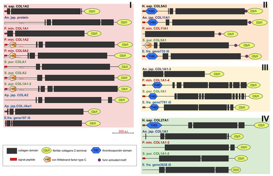 Domain structure of fibril-forming collagens of echinoderms. The length sizes of proteins and domains in the image reflect the lengths of their amino acid sequences. Crinoids (Anneissia japonica)—purple color; asteroids (Patiria miniata)—red color; echinoids (Strongylocentrotus purpuratus)—green color; holothurians (Apostichopus japonicus/Eupentacta fraudatrix)—blue color; hemichordates (Saccoglossus kowalevskii); vertebrates (Homo sapiens)—black color. Groups of proteins (I-IV) are marked with colored areas.