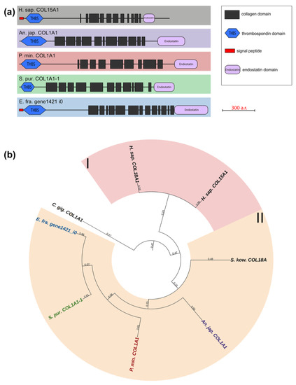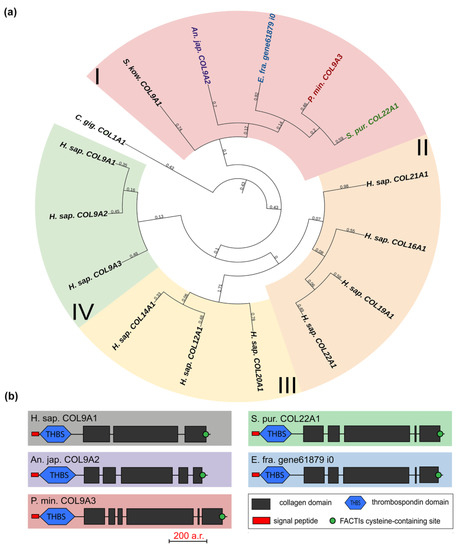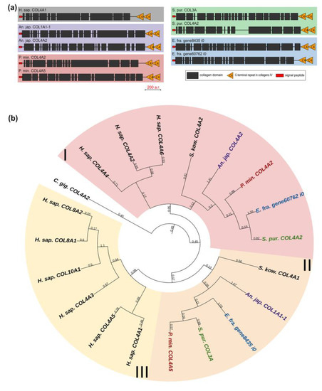 Network-forming collagens of echinoderms. (a). Domain structure. The length sizes of proteins and domains in the image reflect the lengths of their amino acid sequences. (b). Phylogenetic tree showing the relationships of network-forming collagens of vertebrates, hemichordates, and echinoderms. Crinoids (Anneissia japonica)—purple color; asteroids (Patiria miniata)—red color; echinoids (Strongylocentrotus purpuratus)—green color; holothurians (Eupentacta fraudatrix)—blue color; hemichordates (Saccoglossus kowalevskii); vertebrates (Homo sapiens)—black color. Groups of proteins (I–III) are marked with colored areas.