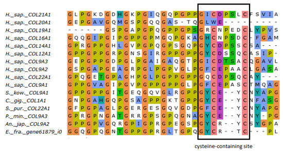 The FACITs group comprises collagens IX, XII, XIV, XVI, XIX, XX, XXI, and XXII. In the studied echinoderm species, one FACITs gene was found. In the phylogenetic tree, they form a separate group, which indicates a significant divergence of FACITs of deuterostomes (Figure 3a, Supplementary File S2). The major structural feature of FACITs is the presence of several short triple-helical domains flanked by non-collagenous sites, which imparts flexibility to the molecule (Figure 3b). Most vertebrate FACITs contain vWA and THBS domains at the N-terminus, while some have FB3 repeats separating these structures [27]. In the echinoderm species studied, FACITs contain only the THBS domain and are closest in structure to collagens IX of H. sapiens. In this regard, this group of echinoderm collagens can be conventionally referred to as collagens IX. A characteristic feature of FACITs is the cysteine-containing site GXCXXXXC at the C-terminus [28]. This site is required for trimerization of polypeptide chains [28]. Echinoderm FACITs have been found to have a similar site (GXCXXC) in this region, which is aligned with human FACITs (Figure 4, Supplementary File S2). FACITs do not form fibrils but are associated with fibrillar collagens and other proteins, acting as a link between different ECM components [27]. In this regard, echinoderm collagens IX may be involved in the processes changing the mechanical properties of MCT.
