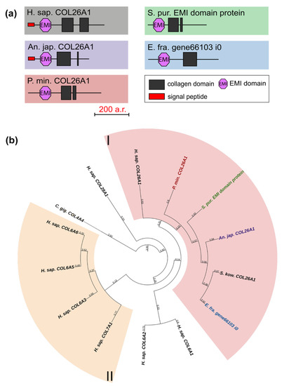 Collagens VI, VII, XXVI, and XXVIII are important components of basement membranes and microfibrillar networks [33,34,35]. The domain organization of these collagens is similar between vertebrates: besides the collagen domain, all have vWA, and some have fibronectin repeats and the C-terminal Kunitz domain, which is cut off during protein maturation [22]. The exception is collagen XXVI, which contains only two triple-helix sites and the EMI domain [36]. In this group, only one gene was found in echinoderms. Its products contain one EMI and one or two triple-helix domains (Figure 6a). In the phylogenetic tree, these are grouped with human collagen XXVI, in connection with which they can be referred to as collagens XXVI (Figure 6b, Supplementary File S4). The function of collagen XXVI remains unclear. In vertebrates, it is known to be expressed in testes and ovaries and is presumably involved in the development of these organs [37]. The presence of the EMI domain required for the multimerization of proteins indicates the ability of collagen XXVI to bind to other ECM components that contain such domains as laminin-type EGF-like, collagen-like, etc. [38].