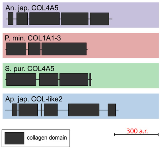 Domain structure of echinoderm unknown collagens. The length sizes of proteins and domains in the image reflect the lengths of their amino acid sequences.