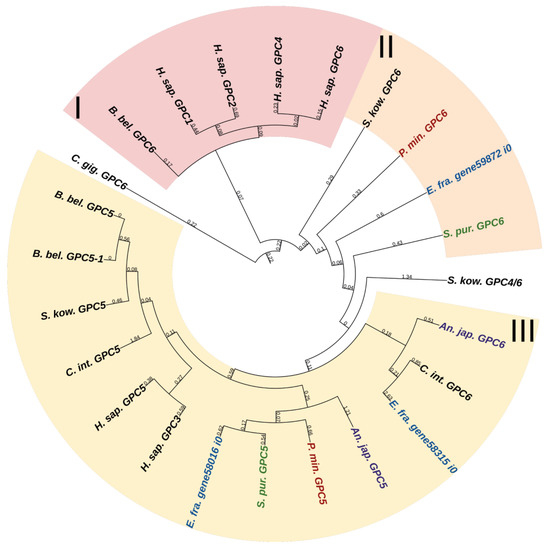Phylogenetic tree showing the relationships of Glypicans of chordates, hemichordates, and echinoderms. Crinoids (Anneissia japonica)—purple color; asteroids (Patiria miniata)—red color; echinoids (Strongylocentrotus purpuratus)—green color; holothurians (Eupentacta fraudatrix)—blue color; hemichordates (Saccoglossus kowalevskii) and chordates (Ciona intestinalis, Branchiostoma belcheri and Homo sapiens)—black color. Groups of proteins (I–III) are marked with colored areas.