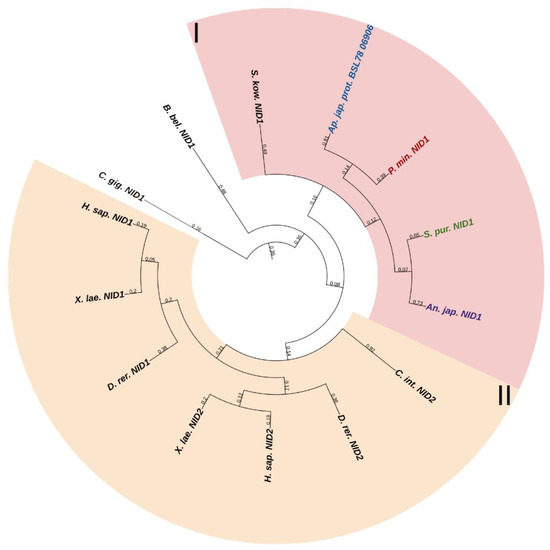 Phylogenetic tree showing the relationships of Nidogens of chordates, hemichordates, and echinoderms. Crinoids (Anneissia japonica)—purple color; asteroids (Patiria miniata)—red color; echinoids (Strongylocentrotus purpuratus)—green color; holothurians (Apostichopus japonicus)—blue color; hemichordates (Saccoglossus kowalevskii) and chordates (Ciona intestinalis, Branchiostoma belcheri and Homo sapiens)—black color. Groups of proteins (I, II) are marked with colored areas.