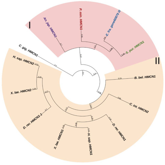 Fibulins (FBLNs) are a family of basement membrane glycoproteins that have an early evolutionary origin [81]. These are recognized in a variety of taxa, from Cnidaria to Chordata [1,82]. Vertebrates have six to seven FBLN genes. Fibulins, due to their ability to bind to ECM molecules such as fibrillin, are involved in the maintenance of connective tissue supramolecular complexes, e.g., microfibrillar networks [83,84]. On the basis of domain structure and length, two subfamilies of FBLNs can be distinguished: the first comprises FBLN 1,2,3,4,5,7; the second, FBLN 6 and 8, also known as hemicentins (HMCN) 1 and 2. One gene from each subfamily was found in echinoderms (Figure 12 and Figure 13, Supplementary Files S10 and S11). On the phylogenetic tree, the FBLNs of echinoderms and vertebrates form separate groups, which indicates the divergence of these genes at the level of the common ancestor of all deuterostomes.