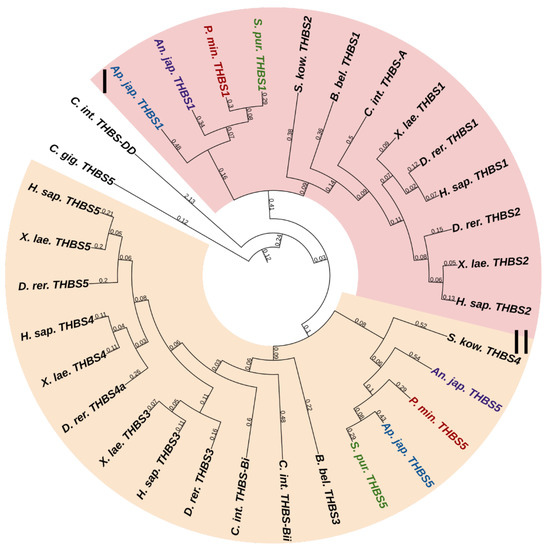 Two THBS genes have been found in all echinoderms (Figure 14, Supplementary File S12). The first encodes a protein that shows similarities to THBS 1 and 2 in vertebrates, and therefore, it can be designated as THBS1/2. In mammals, these THBSs are involved in ECM assembly, platelet aggregation, inflammatory response, and regulation of angiogenesis during regeneration and tumor growth [103]. Moreover, they perform a structural function in ECM, acting as molecular bridges between its components. THBS1 and 2 are capable of binding to integrin and fibrillar collagens [104,105,106].