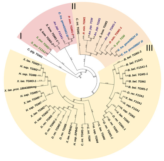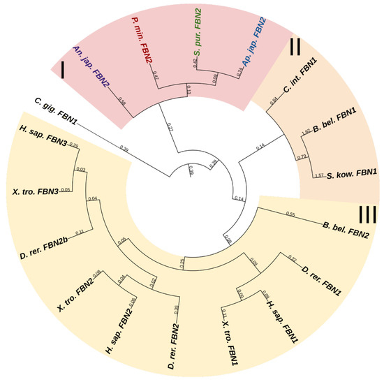 Phylogenetic trees showing the relationships of fibrillins of chordates, hemichordates, and echinoderms. Crinoids (Anneissia japonica)—purple color; asteroids (Patiria miniata)—red color; echinoids (Strongylocentrotus purpuratus)—green color; holothurians (Apostichopus japonicus)—blue color; hemichordates (Saccoglossus kowalevskii) and chordates (Ciona intestinalis, Branchiostoma belcheri and Homo sapiens)—black color. Groups of proteins (I–III) are marked with colored areas.