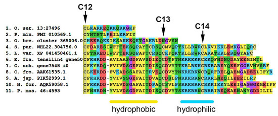 Collagens XV and XVIII are important components of basement membrane required for maintaining its integrity [39]. Due its specific structure, their molecule has a complex “knot/figure-of-eight/pretzel” configuration, which allows forming links with other connective-tissue fibrils [40]. In addition to the structural function, these collagens are involved in the development and carcinogenesis of many tissues [41,42]. For instance, the Endostatin domain is capable of inhibiting migration, proliferation, and causing apoptosis of endothelial cells [43,44]. The possible involvement of multiplexins in the transformation of the body-wall ECM has been reported for holothurians. Expression of collagen XV/XVIII increases in case of asexual reproduction in C. schmeltzii [20].
