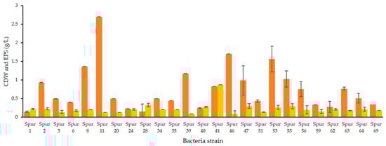 A total of 67 bacterial strains were able to synthetize EPS. The higher yield producers, in 30 mL of M1 medium, revealed production between 0.20 g/L and 0.41 g/L. Of these strains, the 25 bacterial strains that revealed the highest EPS production were tested in a higher scale (200 mL medium M1), yielding higher growth rates (0.05–0.12 h−1) and achieving CDW values between 0.16 ± 0.02 g/L and 2.70 ± 0.20 g/L (Figure 1), corresponding to the strains SPUR-1 and SPUR-11, respectively. The general increase in cellular growth may have been a direct consequence of the improvement in essential parameters, namely stirring and oxygen availability (enabled by the higher head space). Concerning EPS production, the results obtained with the scale increase did not always result in higher EPS production. An example is SPUR-11, which showed production of 0.20 ± 0.01 g/L in 30 mL, but on a 200-mL scale showed slightly lower EPS production of 0.13 ± 0.09 g/L. However, the attained cellular growth was much higher (2.70 ± 0.20 g/L), suggesting a metabolic preference to grow using the available nitrogen and carbon sources, instead of secreting EPS. The strains SPUR-41, -47, and -55 reported the highest production of EPS (0.88 ± 0.02, 0.30 ± 0.07, and 0.30 ± 0.07 g/L, respectively) (Figure 1). It is worth highlighting that for the strains SPUR-28, -41, and -47, the EPS production yield was higher than their cellular growth. Even for cellular growth, the improvement in parameters such as stirring, and oxygen availability may have contributed to the improvement in EPS production. Although the pH was not controlled during the runs, its value practically did not change (pH between 6 and 7), which may have impacted the process positively for higher EPS production. According to the literature, most microorganisms have a preference to produce EPS in media buffered at a neutral and constant pH [19,20].
