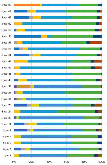 Phylogenetic tree of the alignments of the 16S rRNA gene for three different strains isolated from the Estremadura Spur pockmarks field (Portugal), namely SPUR-41, SPUR-55, and SPUR-64, using the evolutionary model GTR + I + G using jmodeltest-2.1.10 analysis (Vigo University, Vigo, Spain) [45]. Sequences were aligned using MAFFT v7.490 (Osaka University, Suita, Osaka, Japan) [46] and trimmed to 1300 bp with trimAL trimAl 1.2rev59 (Centre for Genomic Regulation, Barcelona, Spain) [47]. The tree was created using Iqtree v2.0.7 (University of Vienna, Vienna, Austria) [48] with 5000 bootstraps.