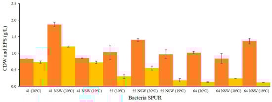 Evaluation of cell dry weight (CDW) (g/L) (●) and exopolysaccharide (EPS) (●) (g/L) production for selected strains cultivated in M1 medium with NSW at 30 °C and 19 °C. Comparison with CDW and EPS from SSW.
