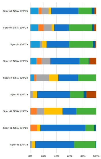 The sugar monomer composition of the EPS synthesized by these SPUR strains (Figure 4) was shown to depend on the different environmental conditions in which the strains were grown, namely on the composition of the medium and the growth temperature. The composition of the EPS produced by SPUR-41 varied across all the different tested conditions. While in SSW at 30 °C, the major components were glucose (32.93% mol) and mannose (58.83% mol), in NSW at 30 °C, there was a relevant decrease in glucose (13.76% mol), and the presence of rhamnose (10.46% mol) was detected. When the growth temperature decreased to 19 °C, arabinose became a component (12.45% mol), and the amount of galactose significantly increased (32.06% mol). Considering SPUR-55, the composition was different from SPUR-41 and with changes across water and temperature variations. In SSW at 30 °C, the EPS was composed mainly of mannose (44.04% mol), glucose (13.86% mol), and galacturonic acid (13.56%mol). Then, when NSW was used for medium preparation, in the assays at 30 °C, the EPS was composed of fucose (5.67% mol), arabinose (19.33% mol), galactose (14.20% mol), glucose (27.10% mol), and mannose (29.86% mol). Moreover at 19 °C with NSW, the EPS also presented a different composition, with the presence of rhamnose (7.63% mol) and galacturonic acid (10.28% mol), while the galactose disappeared (Figure 5). EPS produced by strain SPUR-64 presented some differences when using different cultivation conditions; however, these differences were not as pronounced as in the previous strains (Figure 5). The changes in EPS composition depending on the growth conditions, namely temperature, were already observed for other bacteria, such as Enterobacter A47 [54]. This behavior could be related to enzymatic activity since EPS synthesis enzymes are influenced by culture conditions and are a key factor in EPS monosaccharide composition [55].