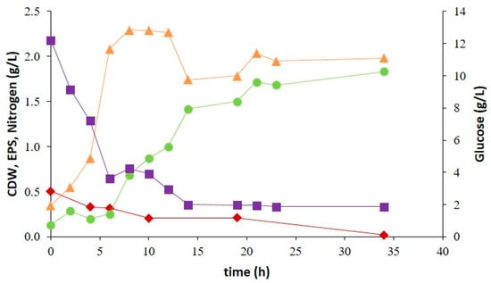 Batch cultivation profile of Brevundimonas huaxiensis SPUR-41 on a 2 L bioreactor using glucose as a carbon source, (■) Glucose (g/L) and (♦) nitrogen consumption (g/L), (▲) cellular growth (CDW, g/L), and (●) EPS production (g/L).