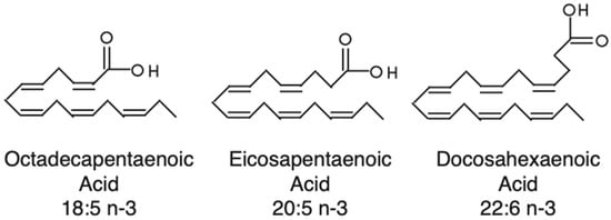Dinoflagellates are known to make polyenoic fatty acids like octadecapentaenoic acid (18:5n-3, i.e., 18 carbons with 5 unsaturated for every 3 carbons) [10], which were first identified from dinoflagellates (dinophytes) and, thereafter, found in raphidophytes and haptophytes (Figure 1). In these microalgae, 18:5 was shown to be confined to galactolipids [11,12]. As suggested by Bell et al. (1997) [10], 18:5n-3 might be more widespread in microalgae than previously thought, as 18:5n-3 might have been misidentified as 20:1n-9 in many studies. The most reasonable hypothesis about 18:5n-3 synthesis is the existence of a yet uncharacterized delta-3-desaturase or that it is synthesized directly as a polyunsaturated fatty acid (PUFA) via PKSs.
