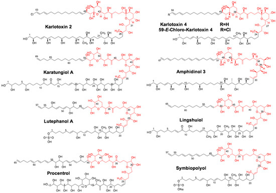 - Van Wagoner, R.M.; Satake, M.; Wright, J.L. Polyketide biosynthesis in dinoflagellates: What makes it different. Nat. Prod. Rep. 2014, 31, 1101–1137. [Google Scholar] [CrossRef] [PubMed]