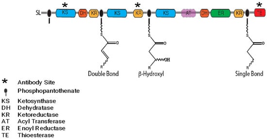 The domain arrangement of a multi-modular polyketide synthase includes three consecutive KS domains, each followed by different modification domains. The estimated molecular weight of this protein is 478 kDa. The sequence ends with a thioesterase domain (TE) in Amphidinium carterae. Sequences similar to this were found in all dinoflagellates surveyed via transcriptome analysis [24]. However, in Amphidinium carterae, the acyl transferase (AT) domain was not found in a cis configuration with the transcript as it was in Akashiwo sanguinea: a dinoflagellate that does not produce a known toxin. The reactions performed by each ketosynthase (KS) module are shown on the phosphopantetheinyl-binding site (Figure 3). Antibodies used in subsequent experiments were synthesized with complementarity to the regions depicted with an asterisk (Figure 3).