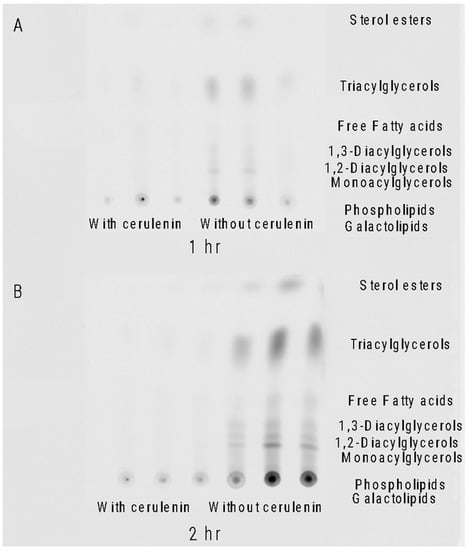 Thin layer chromatography (TLC) of extracted lipids. Triplicate lipid samples showing 14C acetate incorporation patterns with and without 100 μM cerulenin in Amphidinium carterae. (A) Lipid profile of A. carterae 1 h after 14C acetate addition with and without cerulenin incubation. (B) Lipid profile of A. carterae 2 h after 14C acetate addition with and without cerulenin incubation. Lipid classes corresponding to migration on the TLC plate are listed on the right of the image.