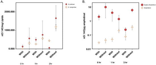 Quantitation of 14C acetate incorporation into lipids and amphidinol over a 2-hour period after cerulenin addition. (A) Quantitation of incorporation of 14C acetate into lipids in A. carterae and A. sanguinea at 0-, 1-, and 2 h time points with and without cerulenin addition. (B) Quantitation of incorporation of 14C acetate into amphidinol and sulpho-amphidinol at 0-, 1-, and 2-h time points with and without cerulenin addition. Error bars show one standard deviation for triplicate samples.