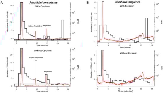 A UV absorbance chromatogram of A. carterae extracts, 2 h post-treatment, monitored at 280 nm, was overlaid with disintegrations per minute (dpm) to show 14C incorporation into sulpho-amphidinol and amphidinol (Figure 6A). Each trace began with a large peak describing the void volume, likely unincorporated acetate or polar metabolites eluting with/composed of acetate, as indicated by the high number of disintegrations per minute measured in that peak (Figure 6). The sulpho-amphidinol was eluted at 9 min, and amphidinol was eluted at 15 min. In the control samples, there was 14C acetate incorporation into both forms of amphidinol, with more incorporation observed in the sulpho-amphidinol form. The sample treated with 100 μM cerulenin showed no incorporation of 14C acetate into the toxin but showed the UV absorbance peaks for existing sulpho-amphidinol and amphidinol at 9 and 15 min, respectively. Aqueous fraction samples for A. sanguinea were also run as a control. Akashiwo sanguinea does not make amphidinols; therefore, there were no peaks in the UV absorbance chromatograms at 280 nm or with 14C acetate incorporation observed at the positions corresponding to amphidinol or sulfo-amphidinol (Figure 6B).