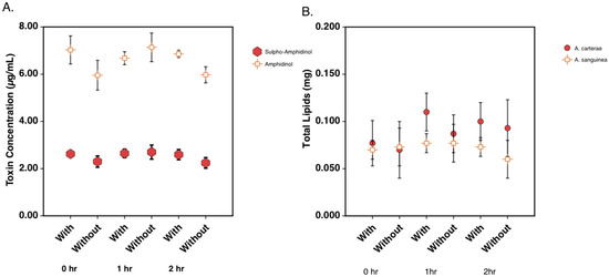 Toxin and lipid levels were quantified during the 2 h cerulenin labeling experiments. Relative sulpho-amphidinol and amphidinol levels were quantified using the area under the curve from LC analysis. The analysis revealed that toxin levels remained relatively constant across the time course of the experiment. The total amphidinol levels remained around 2.5 μg/mL of the culture, while sulpho-amphidinol levels remained at between 5 and 6 μg/mL of the culture (Figure 7A). Lipids were quantified using the dry weight (mg) of the extracted lipids in A. carterae and A. sanguinea. The lipid levels in both species were similar and remained between 0.07 and 0.1 mg lipids across the 2 h experiment (Figure 7B).