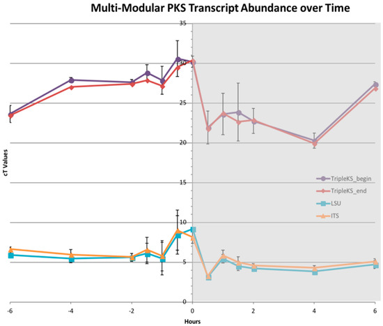 The transcript abundance of the multi-modular PKS showed the same pattern near the light:dark transition, which is in agreement with prior results [25,26,27]. A decrease in transcripts was observed one hour prior to when lights were turned off, and a sharp incline was observed one hour after. Transcript levels further out from this time point remained relatively steady. The two ribosomal proteins, including the internal transcribed spacer (ITS) and ribosomal large subunit (LSU), were used as controls. The transcript levels of the multi-modular PKS were much lower in comparison to the ribosomal proteins, with higher Ct values between 20 and 30, while LSU and ITS had Ct values between 3 and 9, which revealed that these were highly abundant transcripts (Figure 8).