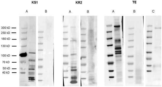 Western blotting analysis of proteins in a multi-domain polyketide synthase (PKS) in Amphidinium carterae. Panes A and B for each antibody refer to Western blots without and with antibody blocking epitope peptides, respectively. KS1: Proteins with the highest band at 106 kDa observed on a 300,000-cell equivalent pellet using an anti-KS1 antibody. KR2: PKS proteins with the highest band at 295 kDa observed on a 250,000-cell equivalent pellet using an anti-KR2 antibody. TE: Proteins with the highest band at 290 kDa observed on a 300,000-cell equivalent pellet using an anti-TE antibody. TE pane C: Proteins with the highest band observed at 290 kDa in a 95,000-cell equivalent native protein lysate using an anti-TE antibody.