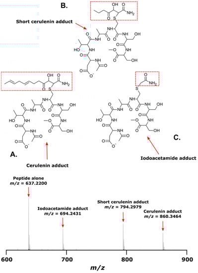 Mass spectrum of synthetic peptide, DTACSS, alone and coupled with cerulenin, a cerulenin analog, and iodoacetamide in vitro. (A) Structure of peptide when reacted with cerulenin; a corresponding ion in mass spectrum is seen at m/z 860.3463. (B) Structure of peptide when reacted with a cerulenin analog with a shorter side chain; a corresponding ion in mass spectrum is seen at m/z 794.2979. (C) Structure of peptide when reacted with iodoacetamide; a corresponding ion in mass spectrum is seen at m/z 694.2431. The ion detected for the peptide alone is observed at m/z 637.2200. Red boxes show the structure of adduct formation.