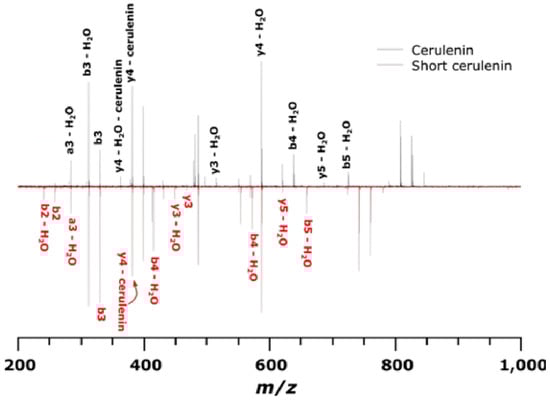 Tandem mass spectra (CID) of KS peptide reacted with cerulenin and the shorter cerulenin analog. The black spectrum denotes product ions for cerulenin-peptide while the red spectrum denotes product ions for short cerulenin-peptide. An ion followed by – cerulenin denotes an ion that has lost its respective adduct during CID.