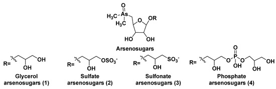 Arsenosugars (1–4) were found in different diatom and green microalgae such as Phaeodactylum tricornutum, Thalassiosira pseudonana, Ostreococcus tauri, Dunaliella tertiolecta, and others [10,11,12,13]. Generally, arsenosugars contain ribose or its derivatives, and marine microorganisms produce arsenoribosides in higher concentrations in comparison to fresh-water microorganisms. Total arsenic concentrations in algae (0.1–10 µg/g of dry mass) is 10–100 times higher than in terrestrial plants [14].
