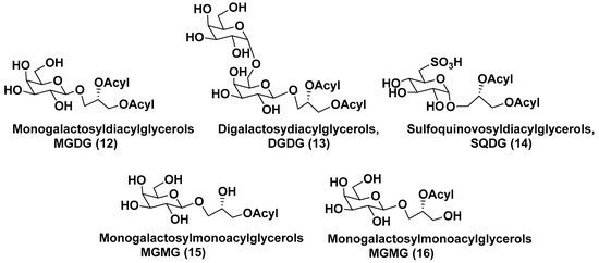 Membranes of plastids are mainly comprised of monogalactosyldiacylglycerols (MGDG, 12) and digalactosyldiacylglycerols (DGDG, 13), along with less abundant sulfoquinovosyldiacylglycerols (SQDG, 14). Galactosylmonoacylglycerols (MGMG) 15 and 16 differ from each other in the position of an acyl group attached to a glycerol residue (Figure 3).