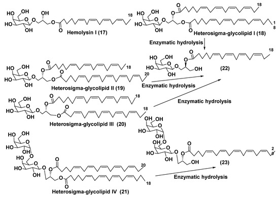 -(1→6)-O-β-D-galactopyranosyl]-sn-glycerol (17) along with an impurity of 1-O-3,6,9,12,15-octadecapentaenoyl-3-O-[β-D-galactopyranosyl-(1→6)-O-β-D-galactopy-ranosyl]-sn-glycerol from the microalga Prymnesium parvum as hemolytically active substance (so-called Hemolysin I) (Figure 4). They used chromatographic separation of galactolipid fraction, enzymatic hydrolysis of obtained compounds and NMR studies to solve the problem of the structure determination of 17 belonging to the group of MGMGs [28].