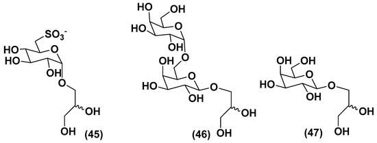 The biomass suspensions of the green microalga Desmodesmus subspicatus stimulated tomato (Solanum lycopersicum) seedlings via a foliar spray. A subfraction, obtained from the aqueous extract of this microalgae by chromatography on a Bio-Gel P-2 column, eluted with ultrapure water contains deacylated glycolipids 6-sulfo-α-D-quinovopyranosyl-(1→1)-glycerol (45), α-D-galactopyranosyl-(1→6)-β-D-galactopyranosyl-(1→1)-glycerol (46), and β-D-galactopyranosyl-(1→1)-glycerol (47) (Figure 6) along with the known zeatin. The subfraction induced increased hypocotyl lengths and volumes of seedlings, in comparison with standard treatment (water) and provided the same effect as a commercial product produced from the brown alga Ascophyllum nodosum. It is considered that, at least partly, these compounds are responsible for plant growth biostimulatory action and have a prospect to be used in the so-called organic agriculture [73].