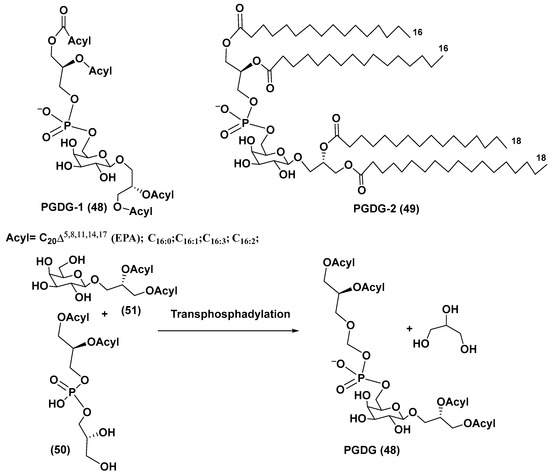 The microalga Thalassiosira weissflogii (CCMP 1336) was selected for the search for new immunomodulatory natural products, using screening of marine extracts with the use of human peripheral blood mononuclear cells (PBMC). In fact, extracts of this microalga induced IL-6 cytokine production in PBMC. A novel minor phosphogalactodiacylglycerol (PGDG-1, 48), containing a phosphate group, galactopyranose and two diacylated glycerol residues, was isolated from the methanol extract of the cultured strain of T. weissflogii by bioassay-guided fractionation using LH-20 gel chromatography with subsequent HPLC. Its structure was determined by NMR and HR ESI MS in comparison with a model compound PGDG-2 (49), obtained by the 15-step synthesis from the commercial D-galactose. PGDG-1 exhibited immunostimulatory activity in human dendritic cells, while compound 49 showed Toll-like receptor-4 agonistic activity in human and murine dendritic cells and caused antigen-specific T-cell activation. The PGDG-1 was tested on monocyte-derived dendritic cells (moDCs) at the concentrations of 10–50 µg/mL and induced upregulation of surface markers at the lowest concentrations. When this substance was examined using moDCs, their maturation was stimulated. Increased expression of interleukins IL-6, IL-8, and IL-12p40 was observed beginning from the concentration of 5 µg/mL. The synthetic compound (49) showed a more remarkable effect on the upregulation of characteristic moDCs markers and the co-stimulatory molecules CD83 and CD86. A scheme of possible biogenesis of PGDGs from phosphatidyldiacylglycerol (50) and galactosyldiacylglycerol (51) by the reaction of transphosphatidylation was proposed and given below (Figure 7) [74].