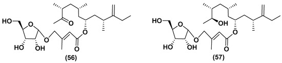 Unique glycosylated polyketide derivatives have been found in several microalgal species. For example, amphidinins D and F (56, 57) belong to the structural type of the so-called amphidinins and are 4,5-secoanalogues of the previously known 12-membered macrolide amphidinolide Q, isolated from the culture of a dinoflagellate Amphidinium sp., which in turn was isolated from the marine acoel flatworm Amphiscolops sp. (Figure 10). The aglycones of these polyketides may be biosynthesized using unique biochemical machinery for a long chain extension by one carbon atom. These compounds contain α-D-ribofuranose residues in the carbohydrate moiety and exhibit moderate antimicrobial and antifungal properties, inhibiting the fungus Trichophyton mentagrophytes at concentrations of 16–32 μg/mL [80].
