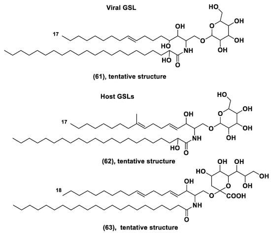 Free sterols are important membrane constituents of eukaryotic organisms but are rarely present in prokaryotes, and well-studied. Sterol-conjugated containing carbohydrates are divided into two structural types: glucosides of sterols (52), predominantly of Δ5 series, and their acylated-by-fatty-acids derivatives (53) (Figure 8). In acylated derivatives, the acyl group occupies the C-6 position in a sugar moiety. These glucose-containing metabolites are frequently accompanied by other conjugated forms, such as steryl sulfates, and by diverse bioactive oxidized sterol derivatives [76]. Steryl glucosides modify biological membranes and provide resistance against temperature stress, regulate the host defense against pathogens and lipid metabolism, and support the development of different organisms. Cholesteryl acyl glucosides (53) stimulated lymphocytes in a CD1-dependent manner and are able to protect newborn animals against allergy [77].