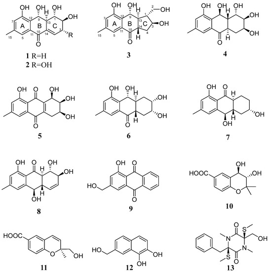 - Sun, P.; Huo, J.; Kurtan, T.; Mandi, A.; Antus, S.; Tang, H.; Draeger, S.; Schulz, B.; Hussain, H.; Krohn, K.; et al. Structural and stereochemical studies of hydroxyanthraquinone derivatives from the endophytic fungus Coniothyrium sp. Chirality 2013, 25, 141–148. [Google Scholar] [CrossRef]