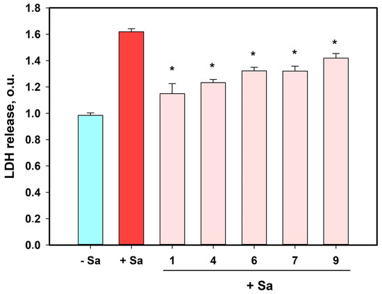 4.11. Cocultivation of HaCaT Cells with S. aureus and Lactate Dehydrigenase Release Test