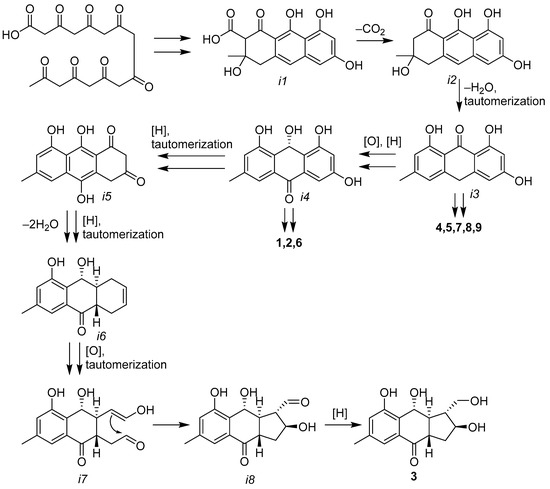 - Griffiths, S.; Mesarich, C.H.; Saccomanno, B.; Vaisberg, A.; De Wit, P.J.; Cox, R.; Collemare, J. Elucidation of cladofulvin biosynthesis reveals a cytochrome P450 monooxygenase required for anthraquinone dimerization. Proc. Natl. Acad. Sci. USA 2016, 113, 6851–6856. [Google Scholar] [CrossRef]