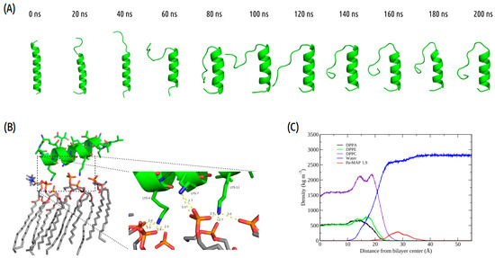 Pa-MAP1.9 MD simulation in the membrane environment. (A) Structural snapshots during 200 ns of trajectory. (B) Tridimensional representation of Pa-MAP1.9 (green), highlighting (dotted square) the region where there is an interaction between the nitrogen NZ of Lys4, Lys7 and Lys11 with the membrane lipids (orange) at 200 ns. (C) Mass density profile of Pa-MAP1.9, water and phospholipids during the last 5 ns of the simulation.
