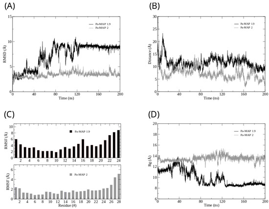 Root mean square deviation (A) for Pa-MAP1.9 (black) and Pa-MAP2 (gray). (B) Distance from the center of mass of Pa-MAP1.9 (black) and Pa-MAP2 (gray) during the simulation. (C) Root mean square fluctuation by residues of the peptides during MD. (D) Radius of gyration for Pa-MAP1.9 (black) and Pa-MAP2 (gray) during 200 ns of the simulation.