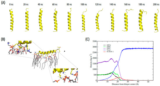 The time evolution of the Pa-MAP2 structural conformation during the 200 ns in contact with the trypomastigote membrane model is shown in Figure 3A. Compared to Pa-MAP1.9, at 200 ns, Pa-MAP2 is located closer to the membrane surface, as observed by the mass density profile (Figure 3C) and the membrane surface distance (Figure 2B). The peptide has embedded more deeply into the water/membrane interface, with lysine side chains interacting with the membrane and alanine side chains facing the solvent region.