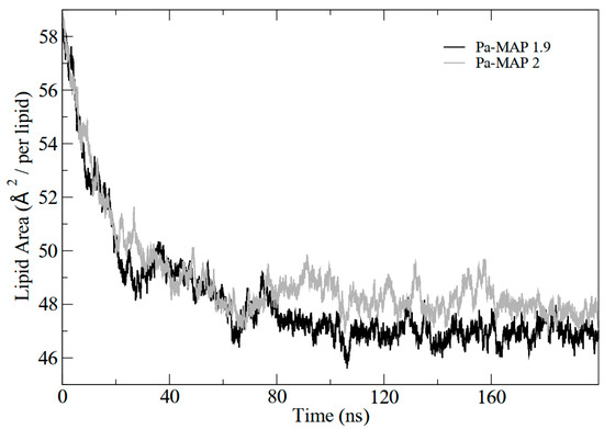 Lipid area graph during molecular dynamics for Pa-MAP1.9(black) and Pa-MAP2 (gray) peptides.