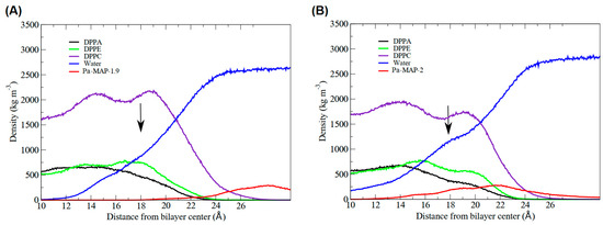 Highlight of the interface region of the mass density profile for the peptides. The black arrow points where, for (A) Pa-MAP1.9 and (B) Pa-MAP2, the water density slightly increased, forming a shoulder-like, indicating permeabilization on the bilayer surface. The red curve shows the density of the peptides (approximation) in relation to the membrane.