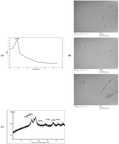 - Kalaba, M.H.; Moghannem, S.A.; El-Hawary, A.S.; Radwan, A.A.; Sharaf, M.H.; Shaban, A.S. Green synthesized ZnO nanoparticles mediated by Streptomyces plicatus: Characterizations, antimicrobial and nematicidal activities and cytogenetic effects. Plants 2021, 10, 1760. [Google Scholar] [CrossRef] [PubMed]