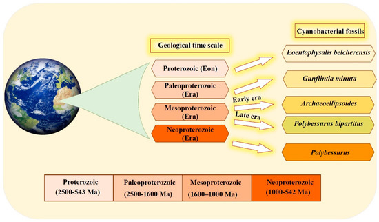 The organized structure and differentiation in the morphology of cyanobacteria, and their dominance in paleontological history [36], are due to the vital role that the unique cyanobacterial metabolism played in ancient ecosystems. This is also influenced by the selectivity of preservation and fossilization for particular environments or cyanobacterial taxa. The cyanobacterial fossil record is one of the oldest, reaching back to approximately 3500 Ma [37]. Fossil identification occurs by comparing old samples (established specimens existing in the herbarium) with modern forms in the natural population [37,38]. Scientists have devoted their efforts to documenting cyanobacteria across different eras (Figure 1). Several studies have documented that the most ancient in disputable fossil cyanobacteria were recorded in the Proterozoic Eon. Eoentophysalis belcherensis Hofmann was the first colonial coccoid microfossil present in this period. Their existence has been reported in intertidal and shallow subtidal environments on a carbonate platform in Canada [38,39]. Other fossils were recorded by Lanier (1989) as dating back to the Paleoproterozoic era. These fossils include vertically and horizontally oriented filaments, viz. Gunflintiaminuta, suggesting photoautotrophic cyanobacteria [40]. During the early Mesoproterozoic era, the cyanobacterial population, including entophysalidacean, oscillatoriacean, and nostocalean cyanobacteria, were widely spread across all possible ecological niches, from supratidal flats to open shelf marine environments [41,42]. The formation of distinct carbonate precipitates in this era helped fossilize a member of what was named the Archaeoellipsoides cyanobacterial genus in India [43]. Although they share many similarities with the extant Synechococcus genus, the samples show residues of akinetes resembling cyanobacteria Nostoc or Stigonema [36,44]. The late Mesoproterozoic era shows evidence of the existence of mat-dwelling and planktic chroococcacean cyanobacteria, with some cyanobacteria recognizable today dating back to the early Mesoproterozoic era. A distinctive feature of the evolution of cyanobacteria is the presence of a stalked cyanobacterium Polybessurus bipartitus [41]. The diversification of protists represents a critical event for developing the biosphere, and this has been documented as occurring in the era now named the Neoproterozoic era. Some new morphological varieties of cyanobacterial fossil debuted in this era, i.e., the remains of the stalked cyanobacterium Polybessurus Fairchild ex Green et al., which can sometimes be found in sediments [36]. In the near past, morphological criteria were solely used to classify cyanobacteria taxonomically; however, in the modern taxonomy, more adequate and complementary tools have been employed [45]. In the last few decades, the criteria of cyanobacterial taxonomic classification have radically changed after applying data obtained from electron microscopic studies along with phylogenetic analyses, mainly derived from molecular sequencing [46]. Modern techniques, such as the molecular method combined with traditional cyanobacterial morphological and ecological diversity studies, as well as the re-evaluation and redefinition of contemporary typical characters and markers of cyanobacterial entities in various biotopes, are inevitable taxonomic criteria for the primary classification. The molecular method used 16S rRNA gene sequencing as a standard, particularly at the genus level. The 16S rRNA gene sequencing clusters correspond to the traditional cyanobacterial taxa, which are identified by distinctive phenotypic features [5,6]. The combination of molecular methods with cyanobacterial taxonomy advanced important key aspects of cyanobacterial systematics as follows: Firstly, regarding various taxonomic units, the morphological characters should concur with their phylogenetic position. Secondly, phylogenetic relationships among cyanobacteria were discovered using combining molecular and phenotypic analyses, and a highly genetic variety was identified, particularly in coccoid and simple filamentous and pseudo-filamentous types [47]. Finally, a number of studies concluded that the fossil record of cyanobacteria, along with the modern methods of re-evaluation and redefinition of contemporary typical characters, helped scientists understand the complexity and diversity present in the history of evolution.