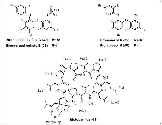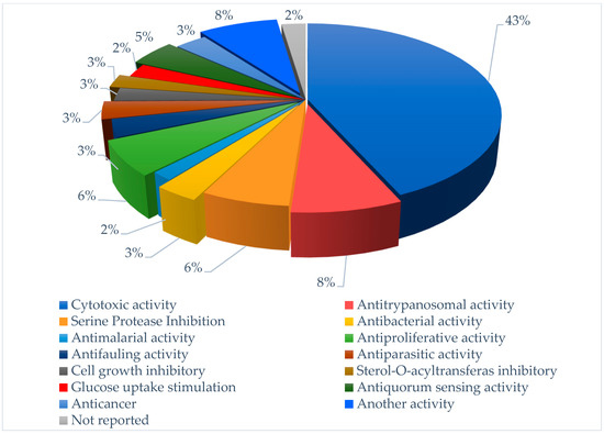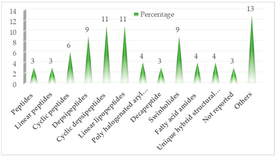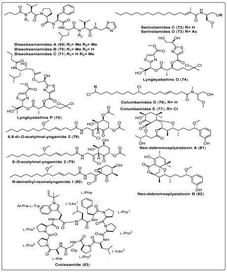 Marine cyanobacteria have valuable potent secondary metabolites, possessing significant pharmacological activities [13]. Here, we survey the different recently isolated compounds with various biological targets, i.e., cytotoxic activity, antiparasitic activity, serine protease inhibition, anticancer and cell proliferation activity, anti-quorum sensing activity, and antibacterial activity of the period between 2017 and 2022 as illustrated in Table 1, Table 2, Table 3, Table 4, Table 5, Table 6 and Table 7 and Figure 2 and Figure 3. It is noteworthy to mention that we described in more detail the highly bioactive compounds.