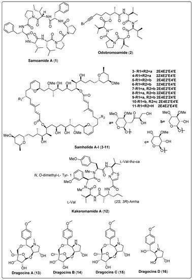 - Iwasaki, A.; Tadenuma, T.; Sumimoto, S.; Ohshiro, T.; Ozaki, K.; Kobayashi, K.; Teruya, T.; Tomoda, H.; Suenaga, K. Biseokeaniamides A, B, and C, sterol O-acyltransferase inhibitors from an Okeania sp. marine cyanobacterium. J. Nat. Prod. 2017, 80, 1161–1166. [Google Scholar] [CrossRef] [PubMed]