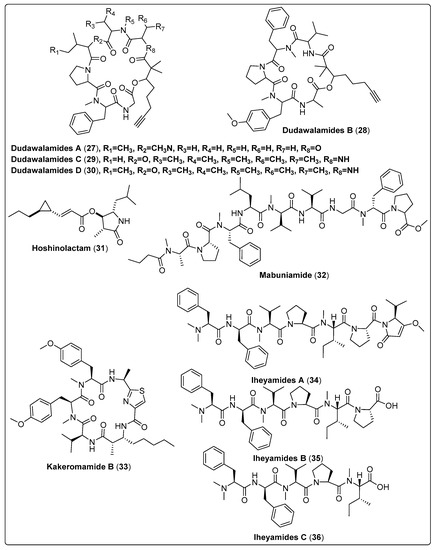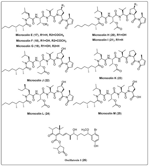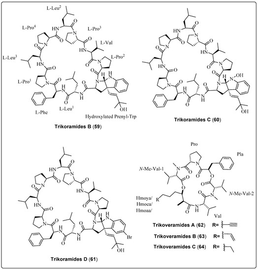 - Phyo, M.Y.; Katermeran, N.P.; Goh, J.X.; Tan, L.T. Trikoveramides A-C, cyclic depsipeptides from the marine cyanobacterium Symploca hydnoides. Phytochemistry 2021, 190, 112879. [Google Scholar] [CrossRef] [PubMed]