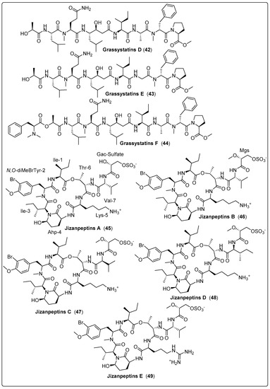 | Grassystatin D, peptide (42) | VPG 14-61/Cetti Bay, Guam (June 2014) | SPE and RP-HPLC | Protease inhibitory activity Assays: Cell viability and inhibition assay Model: Breast cancer cell line (MDA-MB-231) Cathepsin D IC50: 2000 nM Cathepsin E IC50: 30 nM NC: DMSO | [61] |