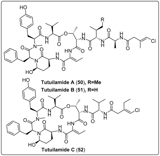 - Keller, L.; Canuto, K.M.; Liu, C.; Suzuki, B.M.; Almaliti, J.; Sikandar, A.; Naman, C.B.; Glukhov, E.; Luo, D.; Duggan, B.M.; et al. Tutuilamides A–C: Vinyl-Chloride-Containing Cyclodepsipeptides from Marine Cyanobacteria with Potent Elastase Inhibitory Properties. ACS Chem. Biol. 2020, 15, 751–757. [Google Scholar] [CrossRef]
